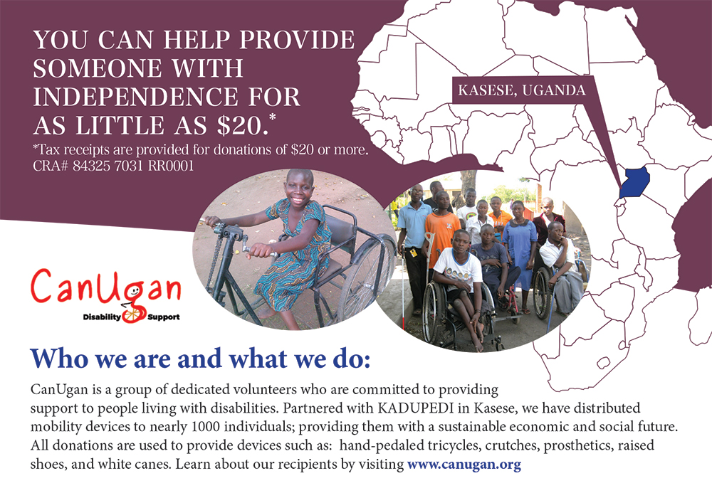 CanUgan is a volunteer organization which provides disability supports to individuals in Kasese, Uganda. Having lived with chronic pain and limited mobility for a long time when I was a young adult, I wanted to help provide supports to others.
